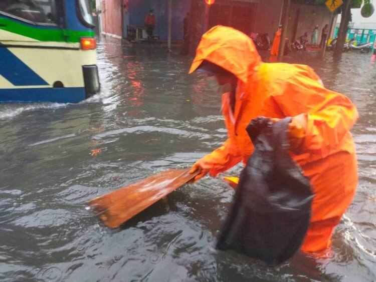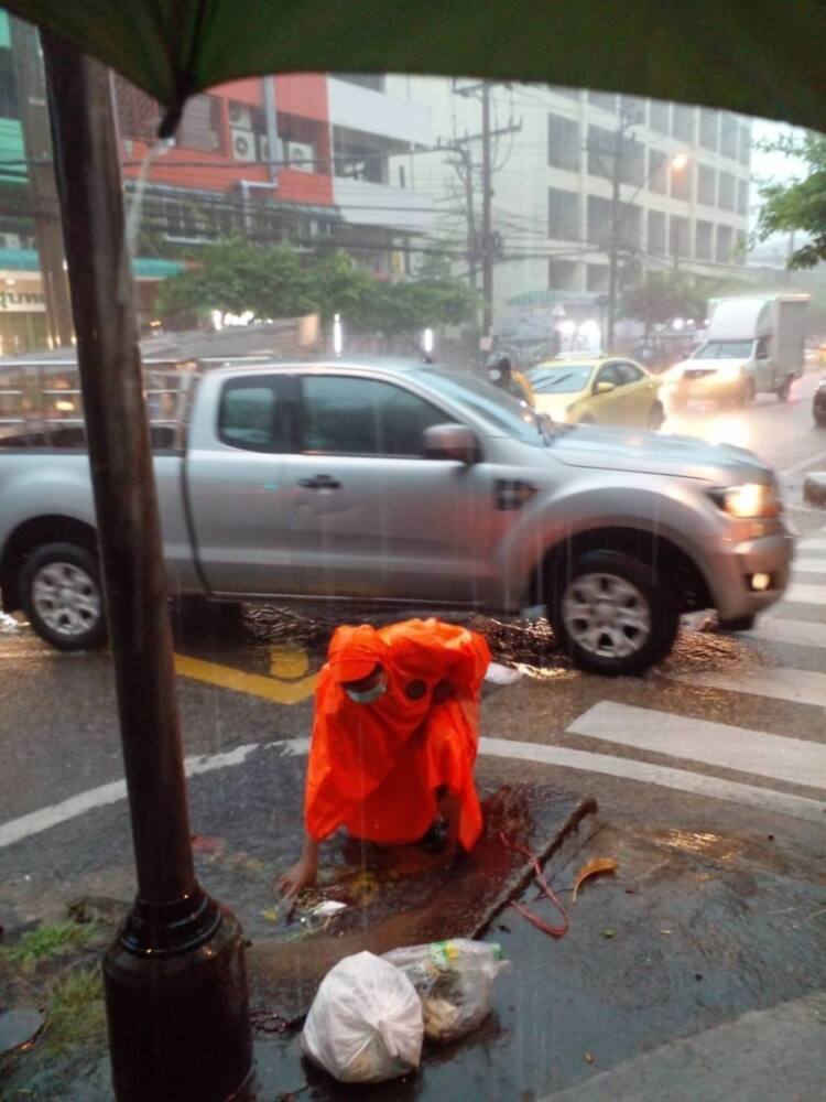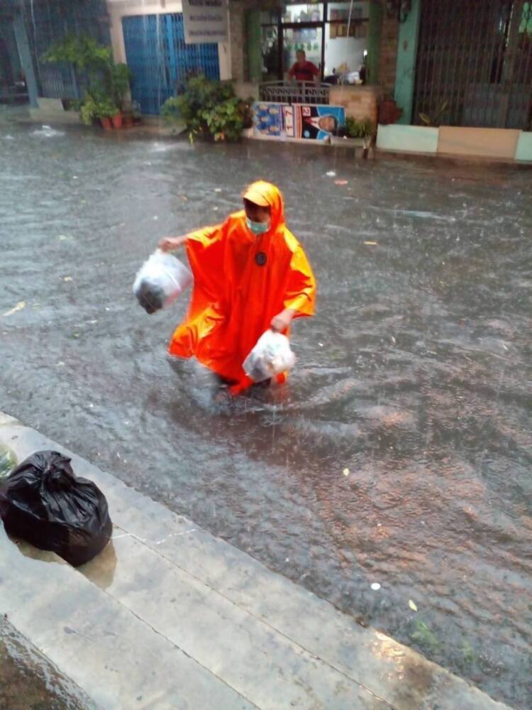 เวลา 15.30 น. : เจ้าหน้าที่เขตสาทร ประจำจุดเครื่องสูบน้ำ และจัดเก็บขยะที่ติดค้าง เก็บใบไม้และขยะหน้าตะแกรง เพื่อเปิดทางน้ำไหลในพื้นที่หลังจากที่มีฝนตกลงมาอย่างหนักปกคลุมทั่วทุกพื้นที่กรุงเทพมหานคร ปริมาณฝนสูงสุดในพื้นที่เขตสาทร 95.5 มม.