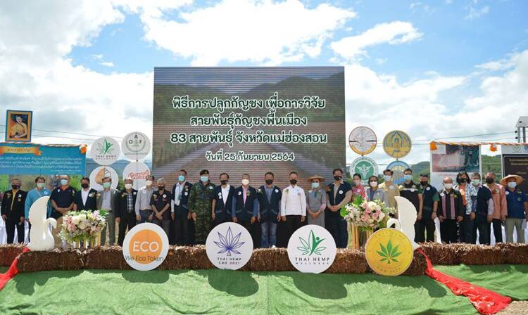 27 ก.ย.64 นายชนก มากพันธุ์ รองผู้ว่าราชการจังหวัดแม่ฮ่องสอน เป็นประธานในพิธีเปิดโครงการ “วิจัยและพัฒนาสายพันธุ์กัญชง พันธุ์ไทยพื้นเมือง 83 สายพันธุ์” โดยมี นพ.เกรียงศักดิ์ หลิวจันทร์พัฒนา ประธานบริษัท ไทยเฮมพ์ เวลเนส จำกัด ดร.เสถียรพงษ์ แก้วสด ประธานกรรมการบริหารบริษัทฯ ดร.เพิ่มศักดิ์ สุภาพรเหมินทร์ พล.อ.สุทัศน์ จารุมณี ประธานที่ปรึกษามูลนิธิวนเกษตรอินทรีย์ รศ.ดร.ชาตรี มณีโกศล อธิการบดีมหาวิทยาลัยราชภัฎเชียงใหม่ นายกรัณย์พล แสงทอง ผู้อำนวยการสำนักจัดการทรัพยากรป่าไม้ที่ 1 สาขาแม่ฮ่องสอน บจก.เซ็ปเป้ และ บจก.วี อีโค ร่วมให้การต้อนรับและเปิดโครงการ พร้อมกันนี้ได้ร่วมกับหน่วยงานภาครัฐ ภาคเอกชน และเกษตรกร ปลูกต้นกัญชงต้นแรกทั้ง 83 สายพันธุ์ในแปลงวิจัย ที่ ศูนย์วิจัยกัญชง หมู่ที่ 4 ต.ผาบ่อง อ.เมืองแม่ฮ่องสอน จ.แม่ฮ่องสอน