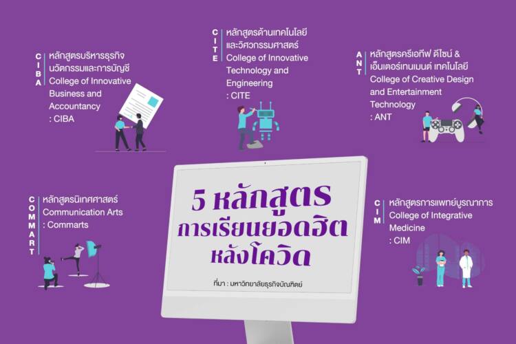 มหาวิทยาลัยธุรกิจบัณฑิตย์ เผยข้อมูลการรับสมัครนักศึกษา Dek64 พบ 5 หลักสูตรที่นักศึกษาไทยให้ความสนใจเพิ่มมากขึ้น ได้แก่ นวัตกรรมเทคโนโลยี ครีเอทีฟดีไซน์ บริหารธุรกิจ คอนเทนต์ออนไลน์ และสุขภาพความงาม