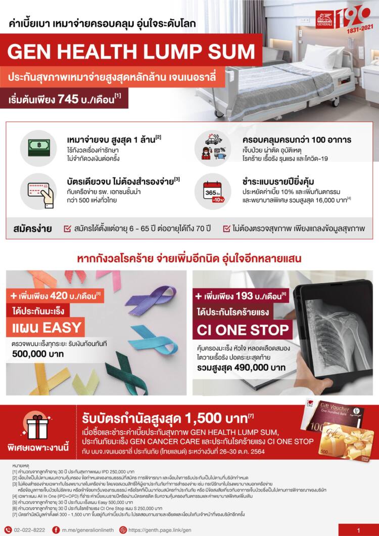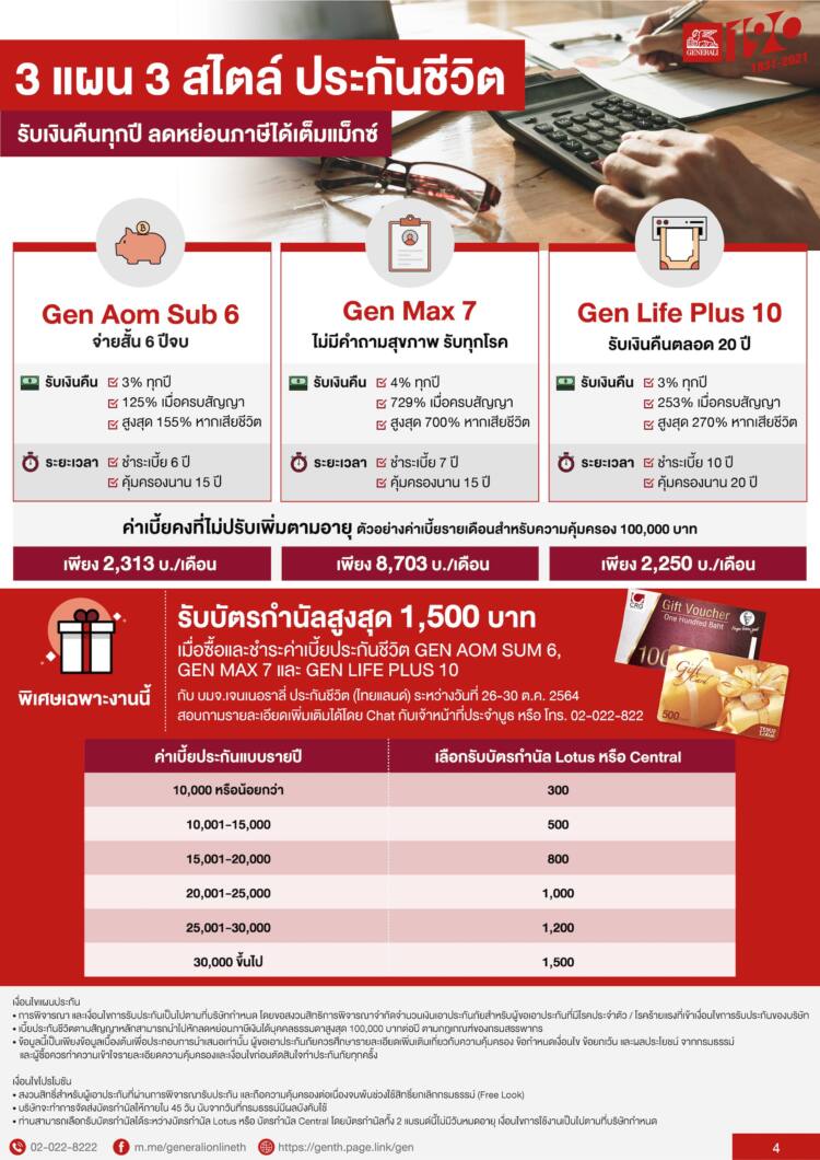 สิทธิพิเศษสำหรับผู้ที่ซื้อผลิตภัณฑ์ประกันชีวิตและประกันสุขภาพของเจนเนอราลี่ภายในงาน ทั้ง Gen Health Lump Sum, Gen CI One Stop, Gen Cancer Care, Gen Aom Sum 6, Gen Max 7, Gen Life Plus 10 และ ประกันสำหรับผู้สูงอายุ Gen Senior 55 รับบัตรกำนัลมูลค่าสูงสุดกว่า 1,500 บาท* โดยสามารถเลือกรับบัตรกำนัลได้ระหว่างบัตรกำนัล Lotus หรือ บัตรกำนัล Central