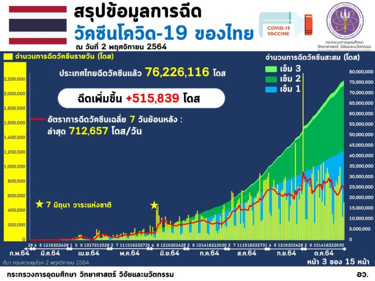 - อัตราการฉีดวัคซีนตั้งแต่ 28 ก.พ.- 2 พ.ย. 64 พบว่า ประเทศไทยฉีดวัคซีนแล้ว 76,226,116 โดส ฉีดเพิ่มขึ้น 515,839 โดส (อัตราการฉีดล่าสุดเฉลี่ย 3 วันย้อนหลัง ตั้งแต่วันที่ 7 มิ.ย. 64 ซึ่งเป็นการฉีดวัคซีนวาระแห่งชาติ 712,657 โดส/วัน