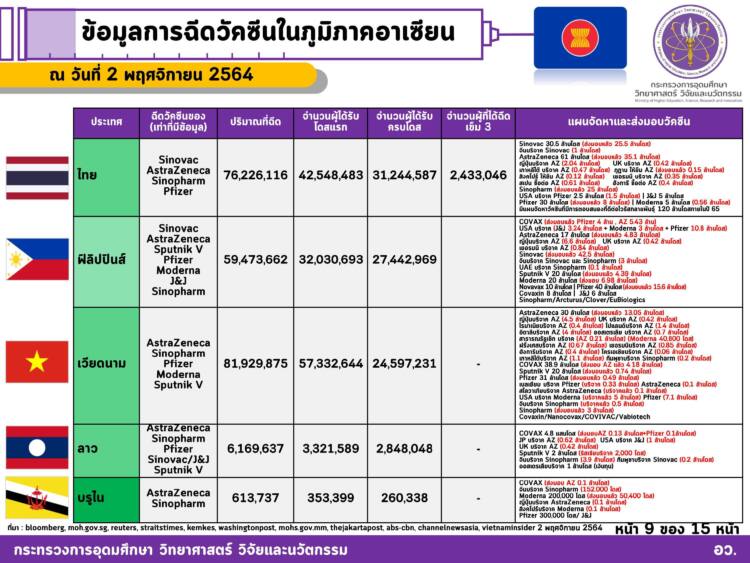 “อว. เผยฉีดวัคซีนของไทย ณ วันที่ 2 พฤศจิกายน 2564 ฉีดวัคซีนแล้ว 76,226,116 โดส และทั่วโลกฉีดแล้ว 7,099 ล้านโดส ใน 205 ประเทศ/เขตปกครอง ส่วนอาเซียนฉีดแล้วทุกประเทศ รวมกันกว่า 529.3 ล้านโดส โดยกรุงเทพฯ ยังเป็นพื้นที่ฉีดวัคซีนเข็ม 1 มากสุด (109.5%)