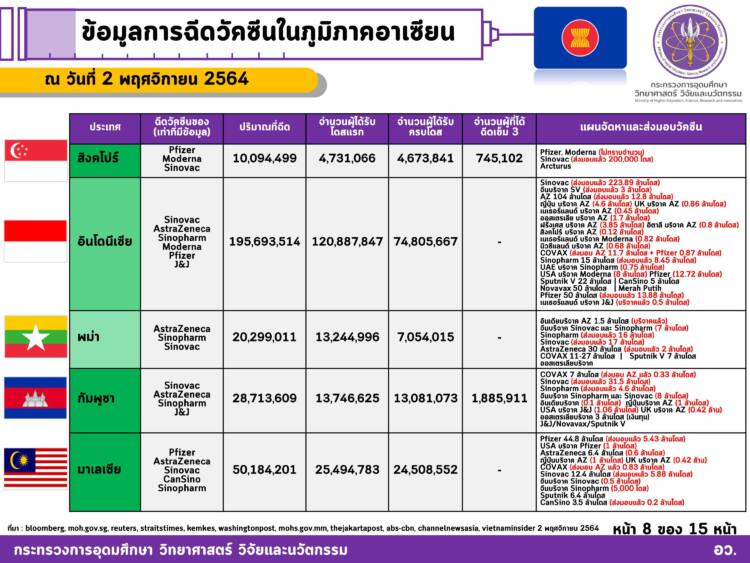 - ในภูมิภาคอาเซียน ได้ฉีดวัคซีนแล้วครบ 10 ประเทศ รวมจำนวน 529,397,861 โดส ได้แก่