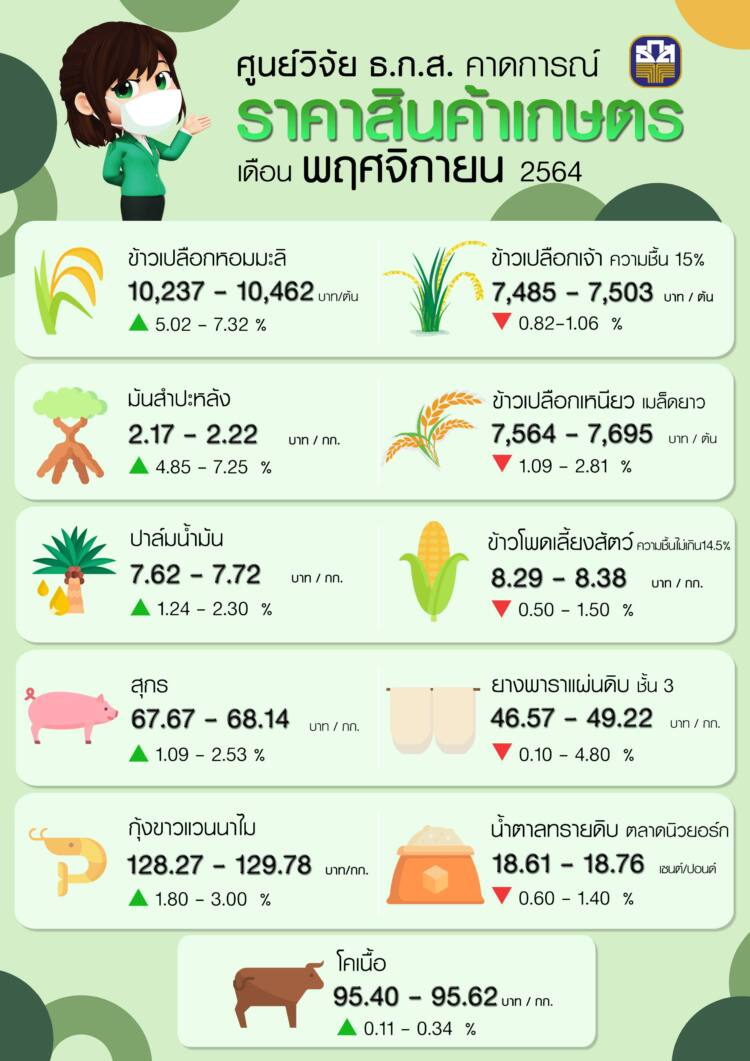 ศูนย์วิจัยและพัฒนานวัตกรรม ธ.ก.ส. ชี้การผ่อนคลายมาตรการล็อกดาวน์เพื่อเตรียมเปิดประเทศ ความต้องการภายในประเทศและตลาดโลก รวมถึงปัญหาภัยธรรมชาติ ทำให้ราคาสินค้าเกษตรเดือนพฤศจิกายน 2564 ได้แก่ ข้าวเปลือกหอมมะลิ มันสำปะหลัง ปาล์มน้ำมัน สุกร กุ้งขาวแวนนาไม และ โคเนื้อ มีแนวโน้มราคาเพิ่มขึ้น ด้านข้าวเปลือกเจ้า ข้าวเปลือกเหนียว ข้าวโพดเลี้ยงสัตว์ ยางพาราแผ่นดิบ และน้ำตาลทรายดิบ มีแนวโน้มราคาปรับลดลง