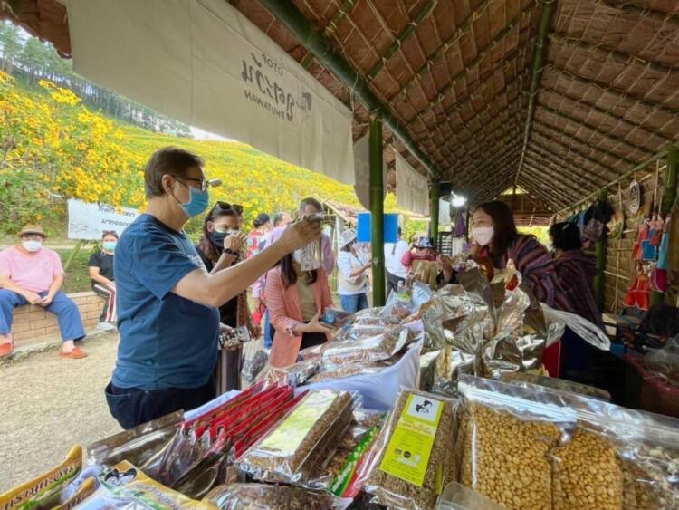 พช.แม่ฮ่องสอน นำสินค้า OTOP วางขายดอยแม่อูคอ นักท่องเที่ยวสนใจซื้อสินค้าบนทุ่งบัวตองเป็นจำนวนมาก เพียง 5 วัน สามารถจำหน่ายสินค้าเป็นเงินถึง 2 แสนกว่าบาท