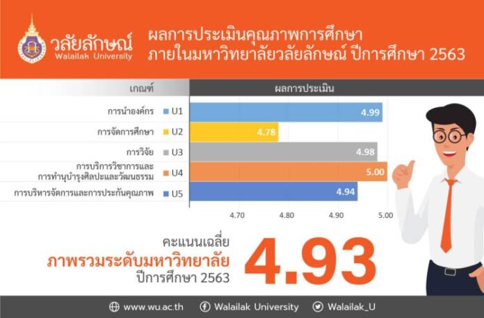 22 พฤศจิกายน 2564 ศาสตราจารย์ ดร.ธวัชชัย ศุภดิษฐ์ รองอธิการบดีฝ่ายวางแผนและยุทธศาสตร์การพัฒนา ม.วลัยลักษณ์ เปิดเผยถึงผลประเมินการประกันคุณภาพการศึกษา ภายใน ระดับมหาวิทยาลัย ตามกรอบ WUQA โดยมีเกณฑ์พื้นฐานสากล AUN-QA (ASEAN University Network Quality Assurance) ในรอบปีการศึกษา 2563 ผลปรากฏว่า มหาวิทยาลัยวลัยลักษณ์ได้รับผลการประเมิน คะแนนเฉลี่ย 4.93 คะแนน จากคะแนนเต็ม 5 อยู่ในระดับดีมากและถือเป็นคะแนนสูงที่สุดตั้งแต่มีการก่อตั้งมหาวิทยาลัยแห่งนี้มา
