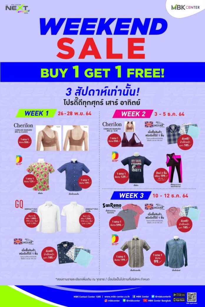 เปลี่ยนสุดสัปดาห์เป็นสุขสัปดาห์กับโปรดี๊ดีทุกวันศุกร์ เสาร์ อาทิตย์ ศูนย์การค้าเอ็ม บี เค เซ็นเตอร์ จัดหนักแคมเปญ WEEKEND SALE เอาใจขาช้อปกับโปรโมชั่น BUY 1 GET 1 FREE โดย WEEK 1 ระหว่างวันศุกร์ที่ 26 ถึงวันอาทิตย์ที่ 28 พฤศจิกายน 2564 พบกับสินค้าโปรฯสุดคุ้มมากมาย CHERILON SEAMLESS BRA รุ่น CLASSIC ซื้อ 1 แถม 1 ในราคาพิเศษ 550 บาท Discount Outlet เสื้อยืด 1 แถม 1 พิเศษราคา 129 บาท เสื้อเชิ้ตแขนสั้น 1 แถม 1 พิเศษราคา 199 บาท GQ White™️ Shirt แขนยาว ช้อป 2 ชิ้นเพียง 1,800 บาท จากปกติ 1,990 บาท GQ White™️ Shirt แขนสั้น ช้อป 2 ชิ้น เพียง 1,500 บาท จากปกติ 1,790 บาท JAGUAR เมื่อซื้อสินค้าชนิดใดก็ได้ 1 ชิ้น รับฟรีผ้าเช็ดหน้ามูลค่า 185 บาท