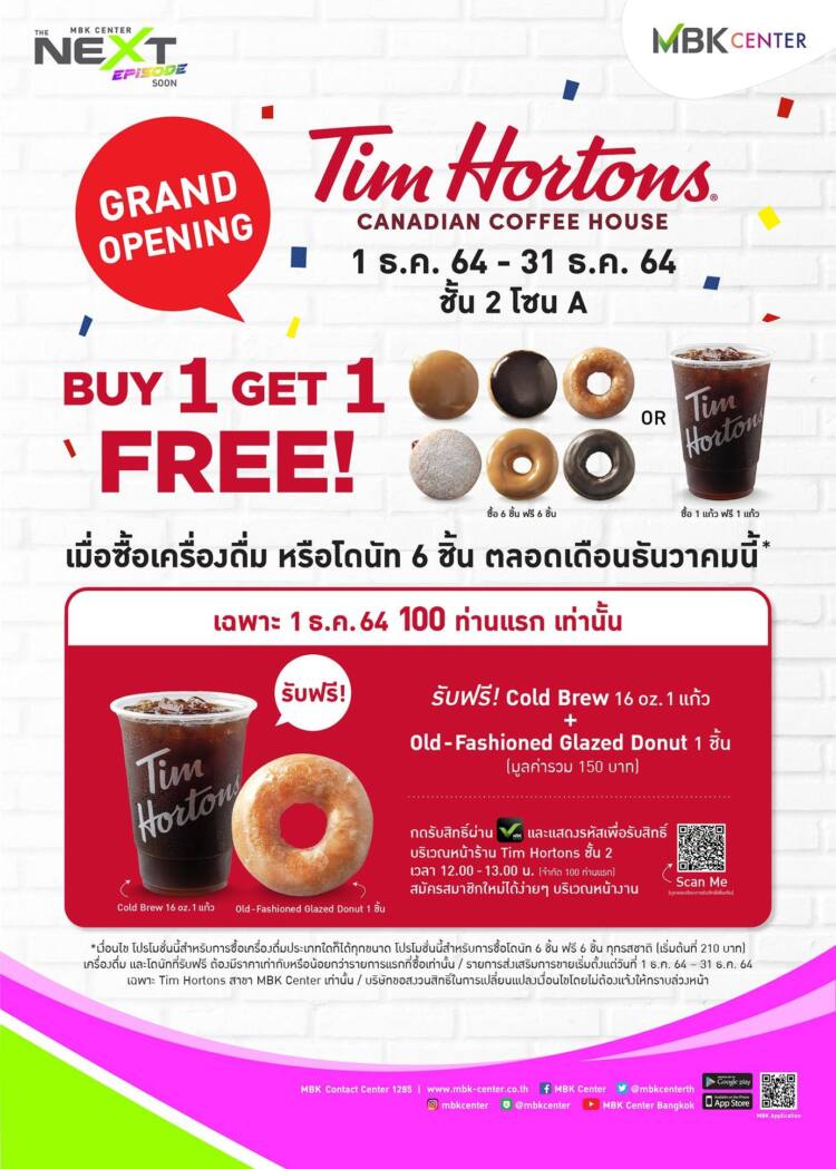 เอ็ม บี เค เซ็นเตอร์ ชวนมาดื่มด่ำกับกาแฟและเครื่ องดื่มอีกมากมายในบรรยากาศชิลๆ วิวรถไฟฟ้ากับร้านกาแฟแบรนด์ดั งจากแคนาดา ทิม ฮอร์ตันส์ (Tim Hortons) สาขาใหม่ล่าสุดตั้งอยู่ที่ชั้น 2 โซน A พร้อมฉลองเปิดสาขาใหม่ (GRAND OPENING) จัดโปรโมชัน BUY 1 GET 1 FREE สำหรับเมนูเครื่องดื่ม หรือ โดนัท 6 ชิ้น ฟรี 6 ชิ้น ตั้งแต่วันที่ 1 ธันวาคม – 31 ธันวาคม 2564 พิเศษสุด ๆ เฉพาะวันที่ 1 ธันวาคม 2564 สำหรับลูกค้า 100 คนแรกเท่านั้น รับฟรี!! เครื่องดื่ม Cold Brew 1 แก้ว ขนาด 16 ออนซ์ และ โดนัท Old-Fashioned Glazed Donut 1 ชิ้น รวมมูลค่า 150 บาท โดยกดรับสิทธิ์ผ่านแอปพลิเคชัน MBK PLUS และแสดงรหัสเพื่อรับสิทธิ์บริ เวณหน้าร้าน Tim Hortons ตั้งแต่เวลา 12.00 – 13.00 น. สมัครสมาชิกใหม่แอปพลิเคชัน MBK PLUS ได้ง่าย ๆ บริเวณหน้างาน