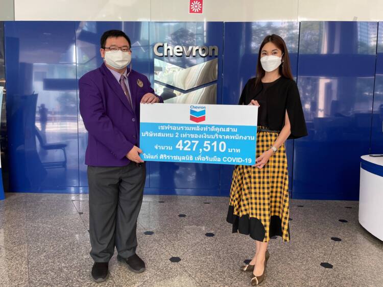นางสาวพรสุรีย์ กอนันทา (ขวา) ผู้จัดการฝ่ายกิจการองค์กร บริษัท เชฟรอนประเทศไทยสำรวจและผลิต จำกัด เป็นตัวแทนบริษัทฯ มอบเงินบริจาคจำนวน 427,510 บาท ให้กับ นายสัณฐิติ เกียรติบูรณกุล (ซ้าย) หัวหน้าสำนักงานศิริราชมูลนิธิ เพื่อสมทบทุนซื้ออุปกรณ์การแพทย์และช่วยเหลือผู้ป่วยโควิด-19 ทั้งนี้ การมอบเงินบริจาคดังกล่าวเป็นกิจกรรมภายใต้โครงการ “Chevron Humankind: เชฟรอนรวมพลัง ทำดีคูณสาม” ซึ่งจัดขึ้นระหว่างเดือนสิงหาคมถึงกันยายนที่ผ่านมา เพื่อส่งเสริมให้พนักงานมีส่วนช่วยเหลือสังคมด้วยการร่วมบริจาคเงินให้กับมูลนิธิ 4 แห่ง ได้แก่ ศิริราชมูลนิธิ มูลนิธิรามาธิบดี สภากาชาดไทย และมูลนิธิโรงพยาบาลสงขลานครินทร์ สำหรับซื้ออุปกรณ์การแพทย์และช่วยเหลือผู้ป่วยจากโรคโควิด-19 โดยบริษัทฯ จะสมทบทุนบริจาคให้อีกสองเท่าของทุกยอดเงินของพนักงาน รวมยอดบริจาคของบริษัทฯ ในครั้งนี้มีจำนวนเกือบ 1,600,000 บาท ทั้งนี้ บริษัทฯ เริ่มดำเนินโครงการ “Chevron Humankind” มาตั้งแต่ปี พ.ศ. 2558 และได้มอบเงินบริจาคให้แก่มูลนิธิและองค์กรการกุศลต่างๆ รวมแล้ว 19,295,690 บาท