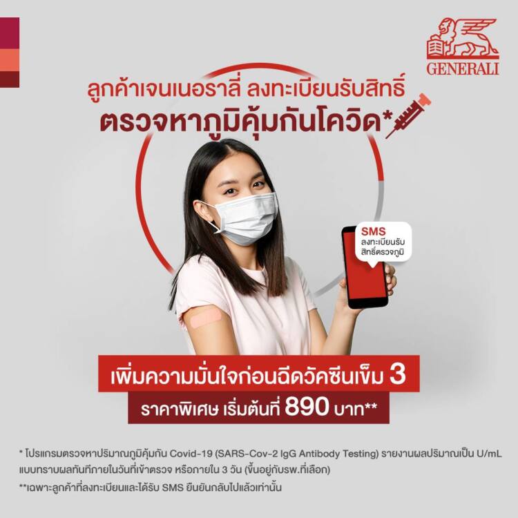 ลูกค้าเจนเนอราลี่ ไทยแลนด์ สามารถรับสิทธิพิเศษได้ง่าย ๆ เพียง ลงทะเบียนผ่าน LINE @Generalithailand ตั้งแต่วันนี้จนถึงวันที่ 15 มกราคม 2565 พร้อมกรอกรายละเอียด ชื่อ-นามสกุล หมายเลขบัตรประชาชน หมายเลขโทรศัพท์เพื่อรับข้อความ (SMS) ยืนยัน และระบุโรงพยาบาลที่ต้องการรับสิทธิ์ จากนั้นรอรับข้อความยืนยันการรับสิทธิ์ โดยสามารถเข้ารับการตรวจภูมิได้ถึง 31 มกราคม 2565*** ส่วนขั้นตอนรับบริการ เพียงนำบัตรประชาชนหรือ SMS ข้อความที่ได้รับ ไปแสดง ณ จุดให้บริการของโรงพยาบาลที่เลือกไว้ รับการตรวจหาภูมิและการชำระค่าใช้จ่ายโดยตรงกับทางโรงพยาบาล