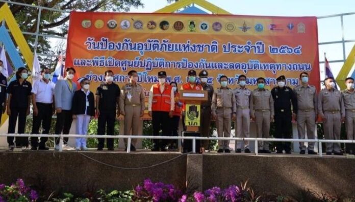 (27 ธ.ค.64) ที่สวนสุขภาพเฉลิมพระเกียรติสมเด็จพระนางเจ้าสิริกิติ์ พระบรมราชินีนาถ อำเภอเมืองมหาสารคาม นายเกียรติศักดิ์ ตรงศิริ ผู้ว่าราชการจังหวัดมหาสารคาม เป็นประธานในพิธีเปิดงานวันป้องกันอุบัติภัยแห่งชาติ ประจำปี 2564 และพิธีเปิดศูนย์ปฏิบัติการป้องกันและลดอุบัติเหตุทางถนนช่วงเทศกาลปีใหม่ พ.ศ. 2564 โดยมี นายธัญญวัฒน์ ชาญพินิจ นายธรรมนูญ แก้วคำ รองผู้ว่าราชการจังหวัดมหาสารคาม พร้อมด้วย หัวหน้าส่วนราชการ องค์กรปกครองส่วนท้องถิ่น และภาคีเครือข่ายทุกภาคส่วน สถานประกอบการ นักเรียน นิสิต นักศึกษา อาสาสมัคร อปพร.มูลนิธิ และประชาชนในจังหวัดมหาสารคาม เข้าร่วมพิธี เพื่อร่วมรณรงค์ป้องกันอุบัติเหตุทางถนนช่วงเทศกาลปีใหม่ และแสดงถึงพลังความสามัคคีของทุกภาคส่วน อันจะเป็นการเสริมสร้างจิตสำนึกวัฒนธรรมความปลอดภัย สามารถลดจำนวนอุบัติเหตุทางถนน จำนวนผู้บาดเจ็บและผู้เสียชีวิต