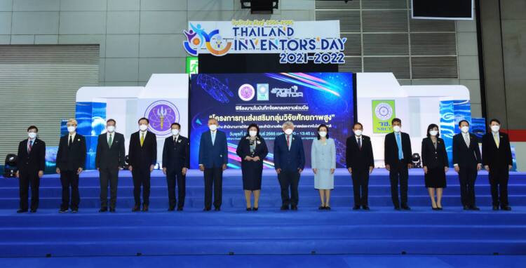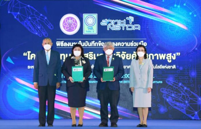 2 ก.พ.65 / ณ EH 102-104 ศูนย์นิทรรศการและการประชุมไบเทค (บางนา) : กระทรวงการอุดมศึกษา วิทยาศาสตร์ วิจัยและนวัตกรรม (อว.) โดยสำนักงานการวิจัยแห่งชาติ (วช.) และสำนักงานพัฒนาวิทยาศาสตร์และเทคโนโลยีแห่งชาติ (สวทช.) ร่วมจัดแถลงข่าวพิธีลงนามบันทึกข้อตกลงความร่วมมือ “โครงการทุนส่งเสริมกลุ่มวิจัยศักยภาพสูง” โดย ดร.วิภารัตน์ ดีอ่อง ผู้อำนวยการสำนักงานการวิจัยแห่งชาติ (วช.) พร้อมด้วย ศาสตราจารย์ นายแพทย์ประสิทธิ์ ผลิตผลการพิมพ์ รักษาการรองผู้อำนวยการ สวทช. และผู้บริหารทั้ง 2 หน่วยงานเข้าร่วมงานและเป็นสักขีพยาน
