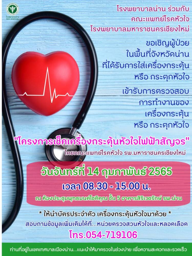 “โครงการเช็คเครื่องกระตุ้นหัวใจไฟฟ้าสัญจร” โดยคณะแพทย์โรคหัวใจ รพ.มหาราชนครเชียงใหม่ วันจันทร์ที่ 14 กุมภาพันธ์ 2565 เวลา 08.30 – 15.00 น. ณ ห้องประชุมพุทธมนต์โชติคุณ ชั้น 5 อาคารสิริเวชรักษ์ รพ.น่าน ให้นำบัตรประจำตัว เครื่องกระตุ้นหัวใจมาด้วย สอบถามข้อมูลเพิ่มเติมได้ที่…หน่วยตรวจสวนหัวใจและหลอดเลือด โทร.054-719106 ผู้ที่อยู่ในเขตเทศบาลเมืองน่านแนะนำให้มาตรวจในช่วงบ่าย เพื่อความสะดวกและรวดเร็ว
