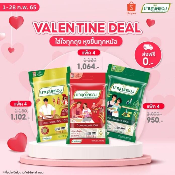ข้าวมาบุญครองฉลองเดือนแห่งความรัก ด้วยผลิตภัณฑ์ข้าวขาวหอมมะลิ 100% ที่ครองใจผู้บริโภค ด้วยดีลสุดเลิฟ พร้อมเสิร์ฟให้กับลูกค้าที่รักทุกท่าน เริ่มฤดูกาลแห่งความรักกับผลิตภัณฑ์ข้าวขาวหอมมะลิใหม่ 100% ข้าวหอมมะลิใหม่ต้นฤดู หอม นุ่ม เหนียว 2 เท่าตลอดปี ขนาด 5 กก. แพค 4 ถุง จากปกติ 1,160 บาท ลดเหลือ 1,102 บาท ต่อด้วยผลิตภัณฑ์ข้าวขาวหอมมะลิ 100% (ถุงแดง) ข้าวหอมมะลิสูตรกลางปี อร่อย หอม นุ่มกำลังดี ขนาด 5 กก. แพค 4 ถุง จากปกติ 1,120 บาท ลดเหลือ 1,064 บาท ปิดท้ายด้วยผลิตภัณฑ์ข้าวขาวหอมมะลิ 100% (ถุงเขียว) สูตรข้าวหอมมะลิเก่า อร่อย หอม นุ่มฟูทุกหม้อ ขนาด 5 กก. แพค 4 ถุง ราคาพิเศษเพียง 950 บาท จากปกติ 1,000 บาท ทุกคำสั่งซื้อจัดส่งฟรีทั่วประเทศ!! เฉพาะที่ร้านค้าข้าวมาบุญครอง ออฟฟิเชียล ช้อป (MahBoonkrongrice_Official Shop) ผ่านช่องทางช้อปปี้ (Shopee) เท่านั้น ตั้งแต่วันนี้ – 28 กุมภาพันธ์ 2565