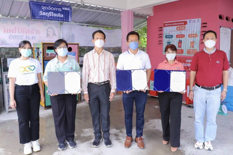 นายสุขุม อังอนันท์ (ที่ 3 จากซ้าย) ผู้ช่วยผู้อำนวยการเขตบางเขน ร่วมเป็นสักขีพยานในพิธีลงนามบันทึก ข้อตกลง (MOU) “ชุมชนไร้ถัง” ระหว่าง นายตรีเทพ ปาลกะวงศ์ ณ อยุธยา (ที่ 4 จากซ้าย) ประธานคณะทำงานโครงการ สานอนาคตการศึกษา CONNEXT ED บมจ.ซีพี ออลล์ ผู้บริหารร้านเซเว่น อีเลฟเว่น และเซเว่น เดลิเวอรี่ ร่วมกับ นางสาว วรรณิศา หงันเปี่ยม (ที่ 5 จากซ้าย) ประธานชุมชนบ้านมั่นคงชุมชนบางบัว พร้อมด้วย นางสาวสุดารัตน์ สังข์ฤทธิ์ (ที่ 2 จากซ้าย) ที่ปรึกษาโรงเรียนอนุบาลทับสะแก จ.ประจวบคีรีขันธ์ ผู้ดูแลโครงการ “ต้นกล้าไร้ถัง” หนึ่งในโครงการต้นแบบภายใต้โครงการ CONNEXT ED CP ALL พร้อมเปิดให้บริการธนาคารขยะ และศูนย์จัดการขยะชุมชนบ้านมั่นคงชุมชนบางบัว เพื่อแก้ไขปัญหาขยะในพื้นที่ชุมชน และสร้างองค์ความรู้ในการจัดการขยะที่ถูกต้องและยั่งยืน ด้วยปณิธาน ร่วมสร้างสรรค์ และแบ่งปันโอกาสต่อกัน ณ ศูนย์เรียนรู้บ้านมั่นคงชุมชนบางบัว เมื่อเร็ว ๆนี้