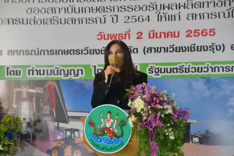 นางสาวมนัญญา ไทยเศรษฐ์ รัฐมนตรีช่วยว่าการกระทรวงเกษตรและสหกรณ์ เปิดเผยว่า ได้มีโอกาสลงพื้นที่ตรวจราชการจังหวัดเชียงราย เพื่อติดตามความก้าวหน้าในการดำเนินโครงการปรับโครงสร้างการผลิต การตลาดและการแปรรูปของสถาบันเกษตรกรรองรับผลผลิตทางการเกษตร ซึ่งเป็นโครงการที่กรมส่งเสริมสหกรณ์ได้รับการจัดสรรงบประมาณจากรัฐบาล เพื่ออุดหนุนให้แก่สหกรณ์การเกษตรนำไปจัดสร้างอุปกรณ์การตลาดต่างๆ สำหรับรองรับการรวบรวมผลผลิตจากเกษตรกรในทุกจังหวัดทั่วประเทศ
