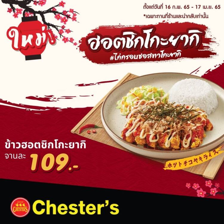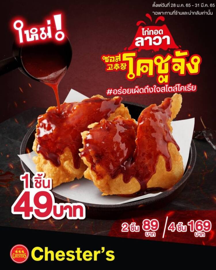 บริษัท เชสเตอร์ฟู้ด จำกัด ธุรกิจร้านอาหารฟาสต์ฟู้ดในเครืบริษัท เจริญโภคภัณฑ์อาหาร จำกัด (มหาชน) หรือซีพีเอฟ ภายใต้แบรนด์ เชสเตอร์ (Chester’s) ออก 3 เมนูใหม่ เอาใจวัยรุ่น เริ่มที่สายเกาหลี ไก่ทอดลาวา ซอสโคชูจัง ไก่ทอดกรอบๆ มาพร้อมซอสโคชูจัง รสเด็ดเผ็ดร้อน ไม่ต้องบินไปไกลถึงเกาหลีก็อร่อยฟินได้ที่เชสเตอร์ 2 ชิ้น เพียง 89 บาทเท่านั้น ถัดมาอีก 2 เมนูเอาใจสาวกญี่ปุ่น ด้วย ข้าวฮอตชิกโกะยากิ อร่อยกับไก่ไม่มีกระดูก ทอดกรอบๆ ราดด้วยซอสทาโกะยากิสไปซี่สูตรลับเฉพาะของเชสเตอร์ โรยด้วยปลาโอและสาหร่าย ทานคู่กับข้าวสวยร้อนๆ เพียงจานละ 109 บาท หรือจะเป็น ฮอตชิกโกะปัง เสิร์ฟในรูปแบบขนมปังฮอทดอกชิ้นใหญ่ คู่กับไก่กรอบไม่มีกระดูก ราดซอสทาโกะยากิสไปซี่ โรยด้วยปลาโอและสาหร่าย อร่อยเต็มๆ คำ เพียงชิ้นละ 59 บาทเท่านั้น เรียกว่า ตอบโจทย์คนรุ่นใหม่ อร่อย สะดวก และรับประทานได้ทุกที่ทุกเวลา