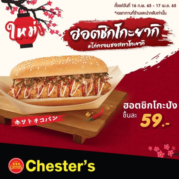 สายญี่ปุ่นต้องไม่พลาด… ชุดฮอตชิกโกะปัง ราคาเพียง 149 บาท (จากปกติ 190 บาท) อร่อยสุดคุ้มกับฮอตชิกโกะปัง คู่ข้าวอบไก่ย่าง และเป๊ปซี่ 16 ออนซ์ 1 แก้ว หรือชุดข้าวฮอตชิกโกะยากิ พิเศษ 149 บาท (จากปกติ 192 บาท) อิ่มฟินกับข้าวฮอตชิกโกะยากิ พร้อมเฟรนช์ฟรายส์ขนาดปกติ และเป๊ปซี่ 16 ออนซ์อีก 1 แก้ว โปรโมชั่นพิเศษตั้งแต่วันนี้ – 17 เมษายน 2565 โดยโปรโมชั่นทั้งหมดเฉพาะทานที่ร้านและนำกลับเท่านั้น สามารถติดตามโปรโมชั่นดีๆ อีกมากมาย ได้ที่เว็บไซต์ www.chesters.co.th หรือ โทร. 1145 พร้อมบริการจัดส่งฟรี เมื่อสั่ง 200 บาทขึ้นไป หรือจะแอดไลน์เป็นเพื่อนกับเชสเตอร์ได้ที่ @chestersthai เพื่อรับสิทธิพิเศษก่อนใคร