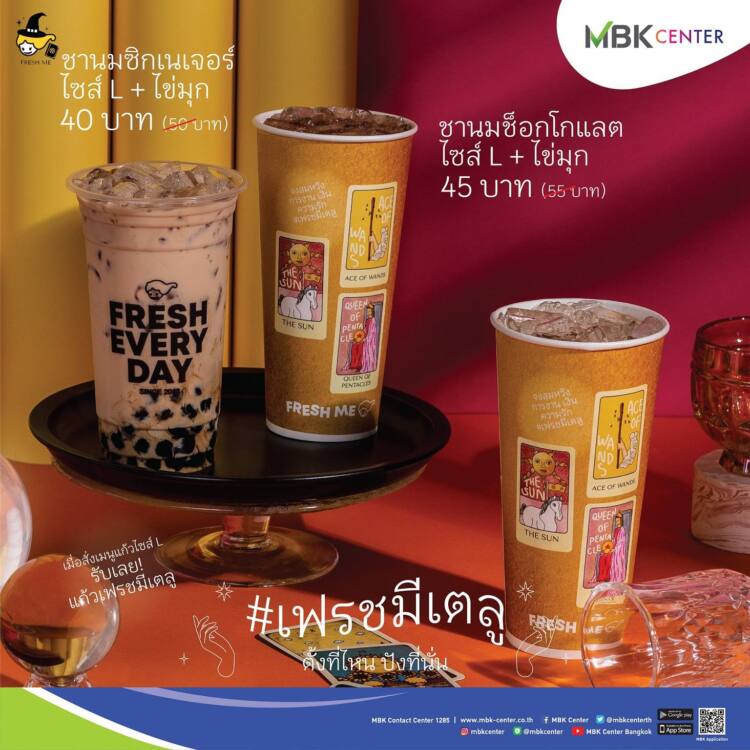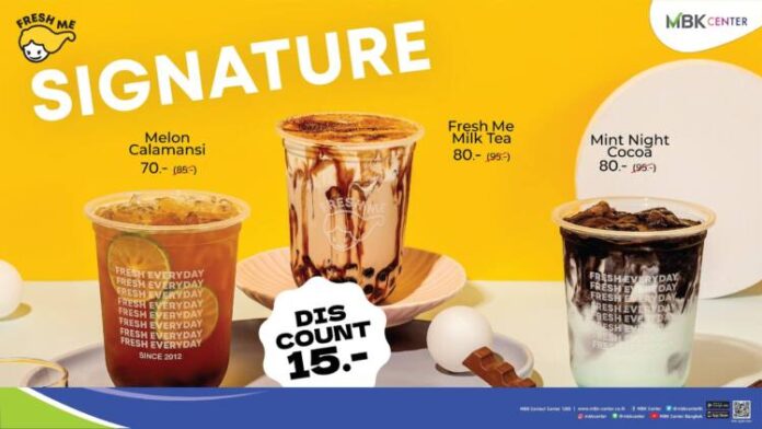 เอ็ม บี เค เซ็นเตอร์ ชวนเติมความสดชื่นกับกองทัพเครื่ องดื่มจากร้าน Fresh Me สาขาใหม่อยู่ที่ชั้น G โซน B พร้อมส่วนลดพิเศษฉลองเปิดร้ านตลอดเดือนมีนาคม ได้แก่ ส่วนลด 15 บาทในเมนู Fresh Me Milk Tea, Mint Night Cocoa และ Melon Calamansi ส่วนลด 10 บาทในเมนู Signature Milk Tea พร้อมไข่มุก ไซส์ L และเมนู Chocolate Milk Tea พร้อมไข่มุก Size L ตั้งแต่วันนี้ – 31 มีนาคมนี้