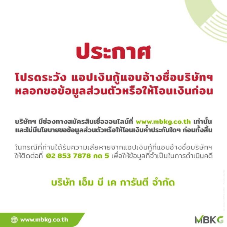 บริษัท เอ็ม บี เค การันตี จำกัด ผู้ให้บริการสินเชื่ออสังหาริมทรัพย์ ซึ่งเป็นหนึ่งในกลุ่มธุรกิจการเงินของบริษัท เอ็ม บี เค จำกัด (มหาชน) ขอเรียนแจ้งให้ลูกค้าทราบว่า ปัจจุบันนี้ได้มี แอปเงินกู้แอบอ้างชื่อบริษัท เอ็ม บี เค การันตี จำกัด เพื่อหลอกขอข้อมูลส่วนตัวรวมถึงให้โอนเงินก่อน ทางบริษัทฯ จึงขอแจ้งเตือนให้โปรดระมัดระวังแอปเงินกู้หลอกลวงในหลายช่องทาง อาทิ ข้อความเอสเอ็มเอส (SMS) หลอกลวง หรือข้อความจากโฆษณาออนไลน์บนเฟซบุ๊ก