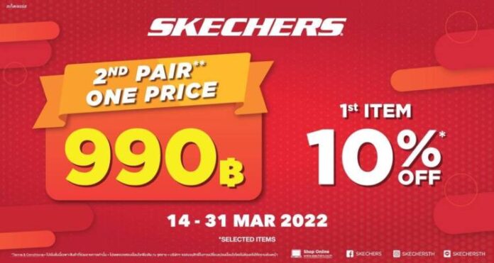 สเก็ตเชอร์ส (SKECHERS) แบรนด์กีฬาและไลฟ์สไตล์ชั้นนำสัญชาติอเมริกัน จัดดีลดีโปรเด็ดอย่างต่อเนื่อง ที่ไม่ใช่แค่หนึ่งแต่ให้ถึงสอง โดยจับคู่ความคุ้มค่า เพียงซื้อรองเท้า 1 คู่ รับส่วนลดทันที 10% และพิเศษสุด ๆ เมื่อซื้อคู่ต่อไปในราคาเดียวเพียง 990 บาท[1] ในคอลเลกชันสุดฮอตทั้งของผู้ชาย-ผู้หญิง และเด็ก ที่ถูกใจสาวกสเก็ตเชอร์สทั้งสายกีฬาสายเพอร์ฟอร์แมนซ์ สายสตรีท อย่างแน่นอน เริ่มตั้งแต่วันนี้ จนถึง 31 มีนาคม 2565 เฉพาะร้าน SKECHERS สาขาที่ร่วมรายการเท่านั้น ปักหมุดรอเลย !! และเตรียมพบกับคูปองส่วนลดพิเศษ มูลค่าสูงสุด 300 บาท ตั้งแต่วันที่ 17 – 31 มีนาคม 2565 นี้