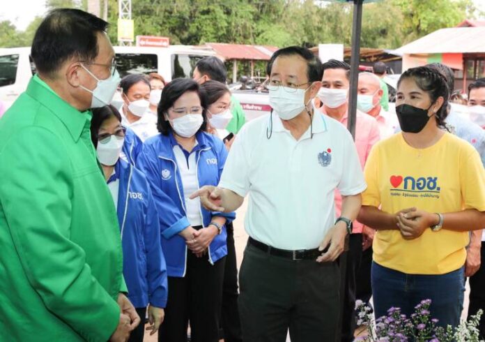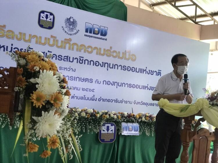 19 มี.ค.65 / ณ วิสาหกิจชุมชนกลุ่มผู้ผลิตดอกเบญจมาศแปลงใหญ่บ้านตาติด ตำบลโนนผึ้ง อำเภอวารินชำราบ จังหวัดอุบลราชธานี นายอาคม เติมพิทยาไพสิฐ รัฐมนตรีว่าการกระทรวงการคลัง เป็นประธานในพิธีลงนามบันทึกความร่วมมือการให้บริการหน่วยรับสมัครสมาชิกกองทุนการออมแห่งชาติ ระหว่าง นายธนารัตน์ งามวลัยรัตน์ ผู้จัดการธนาคารเพื่อการเกษตรและสหกรณ์การเกษตร(ธ.ก.ส.) และ นางสาวจารุลักษณ์ เรืองสุวรรณ เลขาธิการคณะกรรมการกองทุนการออมแห่งชาติ (กอช.) โดยมีนางสาวชุณหจิต สังข์ใหม่ รองปลัดกระทรวงการคลัง ปฏิบัติหน้าที่แทนประธานกรรมการกองทุนการออมแห่งชาติ ร่วมเป็นสักขีพยาน และ นายพงศ์รัตน์ ภิรมย์รัตน์ ผู้ว่าราชการจังหวัดอุบลราชธานี พร้อมด้วยประชาชนในพื้นที่ให้การต้อนรับ