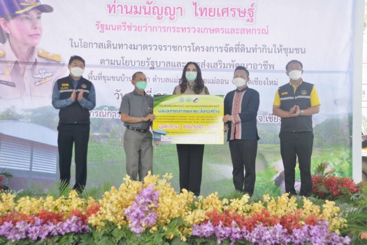 พร้อมกันนี้ รมช.เกษตรฯ ได้มอบอุปกรณ์การตลาด สิ่งก่อสร้าง เงินอุดหนุนภายใต้โครงการส่งเสริมและพัฒนาอาชีพ เพื่อแก้ไขปัญหาที่ดินทำกินเกษตรกร (คทช.) ภายใต้โครงการไทยนิยมยั่งยืน ได้แก่ อุปกรณ์ตัดแต่งผลผลิตทางการเกษตร ห้องเย็นจัดเก็บผลผลิตทางการเกษตร งบประมาณปรับปรุงอาคารรับซื้อผลผลิตทางการเกษตร ซึ่งผ่านมา กรมส่งเสริมสหกรณ์ได้ส่งเสริมวิธีการรวมกลุ่ม การบริหารการจัดการให้แก่กลุ่มอาชีพต่าง ๆ ในชุมชน ให้คนในชุมชนได้รู้และเข้าใจการบริหารจัดการกลุ่มในเชิงสหกรณ์ การสนับสนุนอาคารโรงเรือนเอนกประสงค์ เพื่อใช้เก็บรวบรวมผลผลิตการเกษตรของชุมชน สนับสนุนเจ้าหน้าที่ด้านการเกษตรและการตลาดเพื่อส่งเสริมด้านการผลิตพืชผักอินทรีย์ของชุมชน ทั้งในด้านการวางแผนการผลิต
