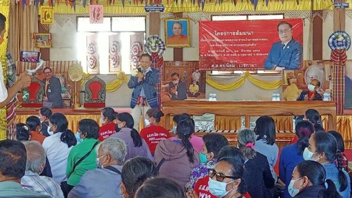 วันที่ 26 มีนาคม 2565 ที่วัดสุธานิวาส บ้านแป้น ต.บ้านแป้น อ.โพนนาแก้ว จ.สกลนคร ดร.นิยม เวชกามา ส.ส.สกลนคร เขต 2 พรรคเพื่อไทย เลขานุการคณะกรรมาธิการ กมธ. ศึกษาการจัดทำและติดตามการบริหารงบประมาณ สภาผู้แทนราษฎร นำวิทยากรจากศึกษาการจัดทำและติดตามการบริหารงบประมาณ สภาผู้แทนราษฎร ออกมาให้ความรู้แก่ชาวบ้าน 5 ตำบล รวม 300 คน ใน อ.โพนนาแก้ว ในเรื่องการมีส่วนร่วมในการสอดส่องดูแลและติดตามงบประมาณ โดยมี นายจำรัส นาแฉล้ม รอง ผวจ.สกลนคร นำกำนัน ผู้ใหญ่บ้าน และ อปท.ให้การต้อนรับ