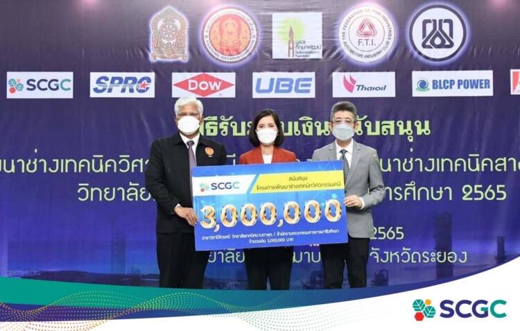 เอสซีจี เคมิคอลส์ หรือ เอสซีจีซี (SCGC) ร่วมมอบเงินสนับสนุนโครงการพัฒนาช่างเทคนิควิศวกรรมเคมี (V-ChEPC) ประจำปี 2565 เป็นจำนวนเงิน 3 ล้านบาท ซึ่งเป็นการสนับสนุนโครงการต่อเนื่องเป็นปีที่ 14 นับตั้งแต่ปี 2551 เพื่อพัฒนาศักยภาพพร้อมผลิตบุคลากรระดับช่างเทคนิคสำหรับอุตสาหกรรมปิโตรเคมี ให้มีความรู้ความสามารถและมาตรฐานที่สอดคล้องตรงตามความต้องการของผู้ประกอบการฯ อีกทั้งยังเป็นการสร้างเครือข่ายความเชื่อมโยงระหว่างสถานศึกษากับภาคอุตสาหกรรม นำไปสู่การพัฒนาขีดความสามารถในระบบการเรียนการสอนหลักสูตรอาชีวศึกษา รวมถึงสามารถถ่ายทอดเทคโนโลยีให้กับสถานศึกษาได้อย่างเป็นระบบและยั่งยืน