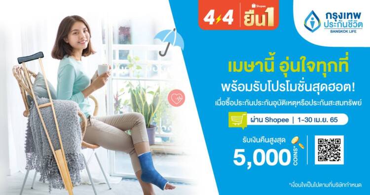 กรุงเทพประกันชีวิต ร่วมมือกับ ‘ช้อปปี้’ (Shopee) ผู้นำแพลตฟอร์มอีคอมเมิร์ซในเอเชียตะวันออกเฉียงใต้และไต้หวัน ฉลองเทศกาลสงกรานต์ผ่านแคมเปญ Shopee 4.4 Shocking Sale วันช้อป โปรช็อก ให้นักช้อปได้อุ่นใจกับความคุ้มครองพร้อมกับโปรดียืน 1 เมื่อซื้อประกันอุบัติเหตุส่วนบุคคล หรือประกันชีวิต ผ่านหน้าร้านออฟฟิเชียลสโตร์ BangkokLife Official บน Shopee Mall ตั้งแต่วันที่ 1 – 30 เมษายน 2565