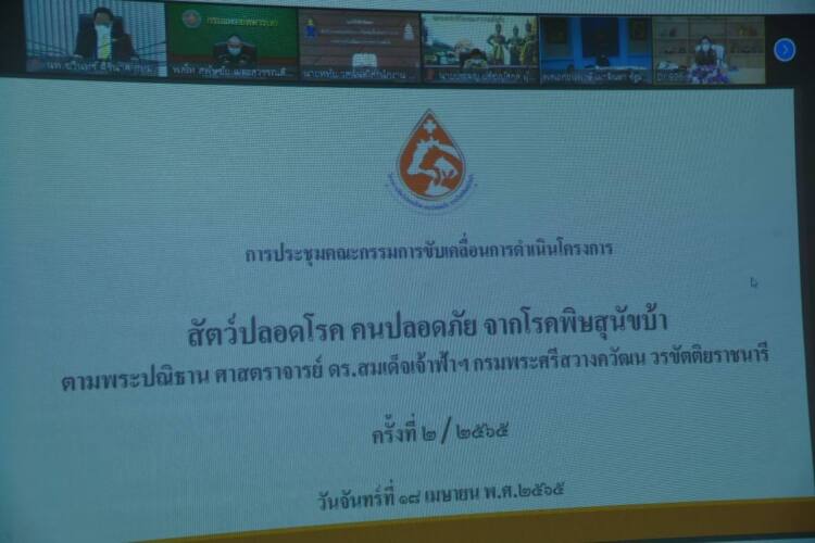 ในที่ประชุมได้รายงานผลการดำเนินโครงการ สัตว์ปลอดโรค คนปลอดภัย จากโรคพิษสุนัขบ้า ศาสตราจารย์ ดร.สมเด็จเจ้าฟ้าฯ กรมพระศรีสวางควัฒน วรขัตติยราชนารี ทรงพระกรุณาโปรดเกล้าให้สัตวแพทย์อาสาจุฬาภรณ์ ออกหน่วยสัตวแพทย์เคลื่อนที่ โดยให้บริการตรวจคัดกรองสุขภาพของสัตว์เบื้องต้น พร้อมให้บริการฉีดวัคซีนป้องกันโรคพิษสุนัขบ้า และการผ่าตัดทำหมันสุนัขและแมว วันที่ 20 – 23 ก.พ.65 และวันที่ 30 – 31 มี.ค. – 2 เม.ย.65 ณ วัดเกษรศีลคุณ (วัดป่าบ้านตาด) อ.เมือง จ.อุดรธานี และทรงตรวจเยี่ยมศูนย์ดูแลสุนัขจรจัดของกองทัพเรือ วันที่ 9 เม.ย.65 ณ หน่วยบัญชาการนาวิกโยธิน อ.สัตหีบ จ.ชลบุรี