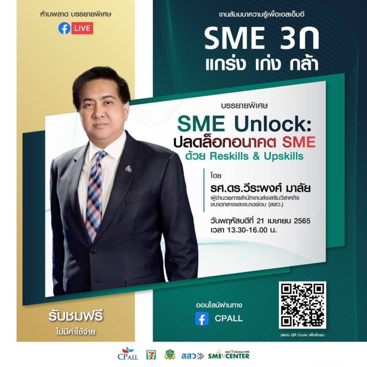 ศูนย์ 7 สนับสนุน SME หรือ 7 SME Support Center ภายใต้การขับเคลื่อนของ บริษัท ซีพี ออลล์ จำกัด (มหาชน) ผู้บริหารเซเว่น อีเลฟเว่นและเซเว่น เดลิเวอรี่ จับมือ สำนักงานส่งเสริมวิสาหกิจขนาดกลางและขนาดย่อม (สสว.) จัดสัมมนาออนไลน์ “SME 3ก แกร่ง เก่ง กล้า” ครั้งที่ 2 ในหัวข้อ “SME Unlock : ปลดล็อกอนาคต SME ด้วยการ Reskills & Upskills” ผ่าน Facebook Live CPALL เพื่อช่วยติดอาวุธด้านความรู้เสริมศักยภาพ SME ไทยให้สามารถเติบโตได้อย่างแข็งแกร่งและยั่งยืน ในวันพฤหัสบดีที่ 21 เมษายน 2565 เวลา 13.30-16.00 น.