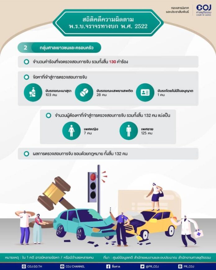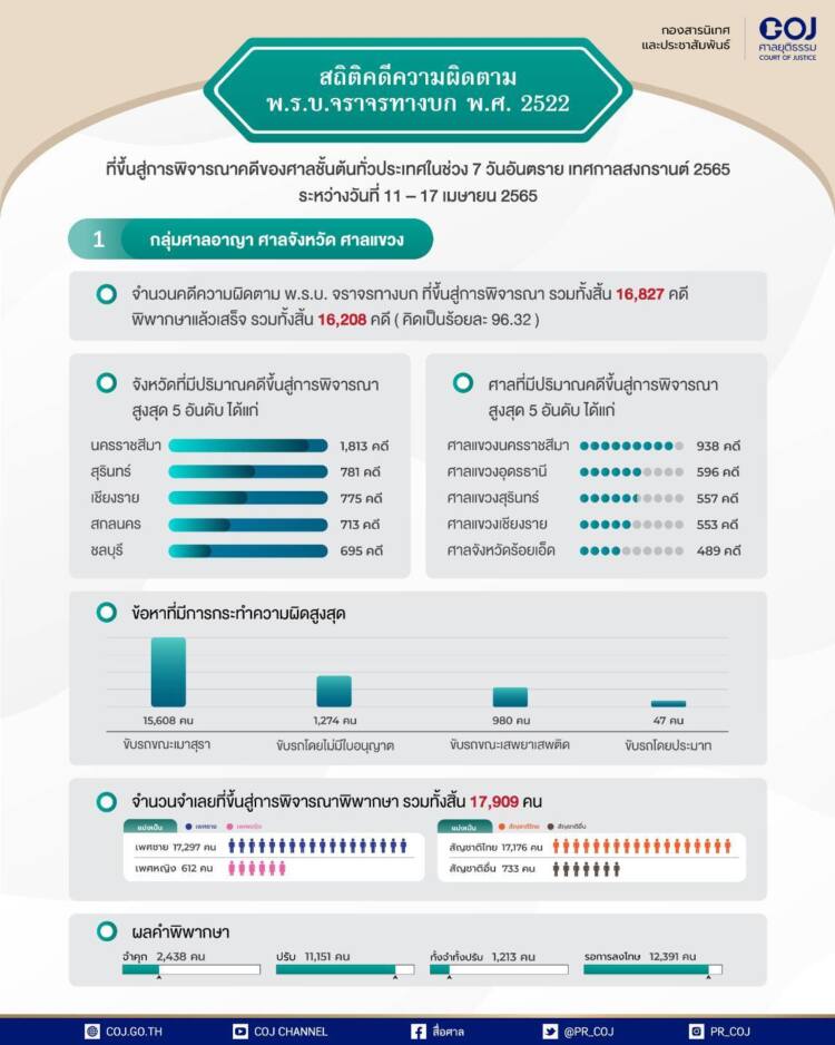 สรุปสถิติคดีความผิดตาม พ.ร.บ.จราจรทางบก พ.ศ. ๒๕๒๒ ที่ขึ้นสู่การพิจารณาคดีของศาลชั้นต้นทั่วประเทศในช่วง 7 วันอันตราย เทศกาลสงกรานต์ 2565 ระหว่างวันที่ 11 – 17 เมษายน 2565