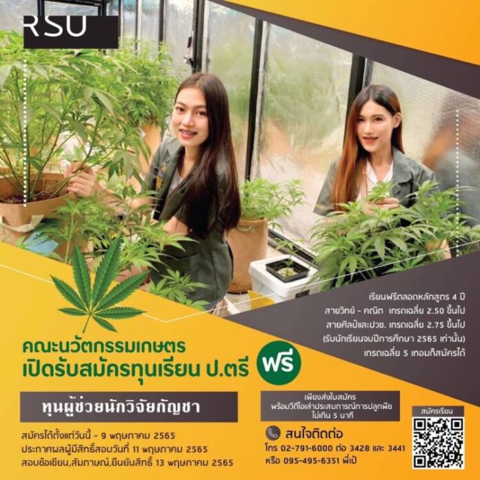 ม.รังสิต ให้ทุนเรียนฟรี ผู้ช่วยนักวิจัยกัญชา