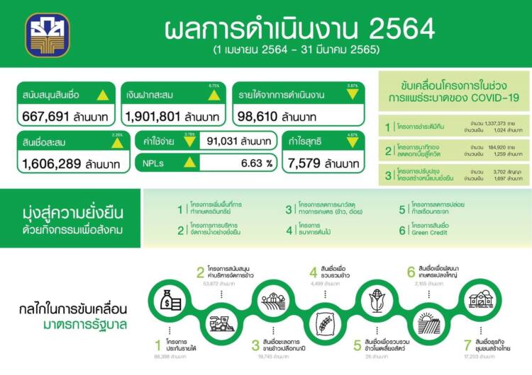 ด้านอัตราผลตอบแทนต่อสินทรัพย์เฉลี่ย (ROA) อยู่ที่ร้อยละ 0.35 อัตราตอบแทนต่อส่วน ผู้ถือหุ้น (ROE) อยู่ที่ร้อยละ 5.22 ขณะที่ NPLs อยู่ที่ร้อยละ 6.63 โดยมีอัตราส่วนเงินกองทุนต่อสินทรัพย์เสี่ยง (BIS) ร้อยละ 12.43 สูงกว่าเกณฑ์ที่ธนาคารแห่งประเทศไทย (ธปท.) กำหนด นอกจากนี้ ธ.ก.ส. ยังได้ดำเนินโครงการเพื่อช่วยแบ่งเบาภาระและเสริมสภาพคล่องลูกค้าในสถานการณ์การแพร่ระบาดของเชื้อไวรัส COVID-19 ผ่าน 3 โครงการ ได้แก่ 1) โครงการชำระดีมีคืน ดำเนินการคืนดอกเบี้ยให้แก่ลูกค้าจำนวน 1,337,373 ราย จำนวนเงินกว่า 1,024 ล้านบาท 2) โครงการนาทีทองลดดอกเบี้ยสู้โควิด ดำเนินการลดดอกเบี้ยให้แก่ลูกค้าที่มีภาระหนัก จำนวน 184,920 ราย จำนวนเงิน 1,259 ล้านบาท และ 3) โครงการปรับปรุงโครงสร้างหนี้แบบยั่งยืน ดำเนินการปรับปรุงโครงสร้างหนี้แล้วกว่า 3,702 สัญญา จำนวนเงิน 1,697 ล้านบาท