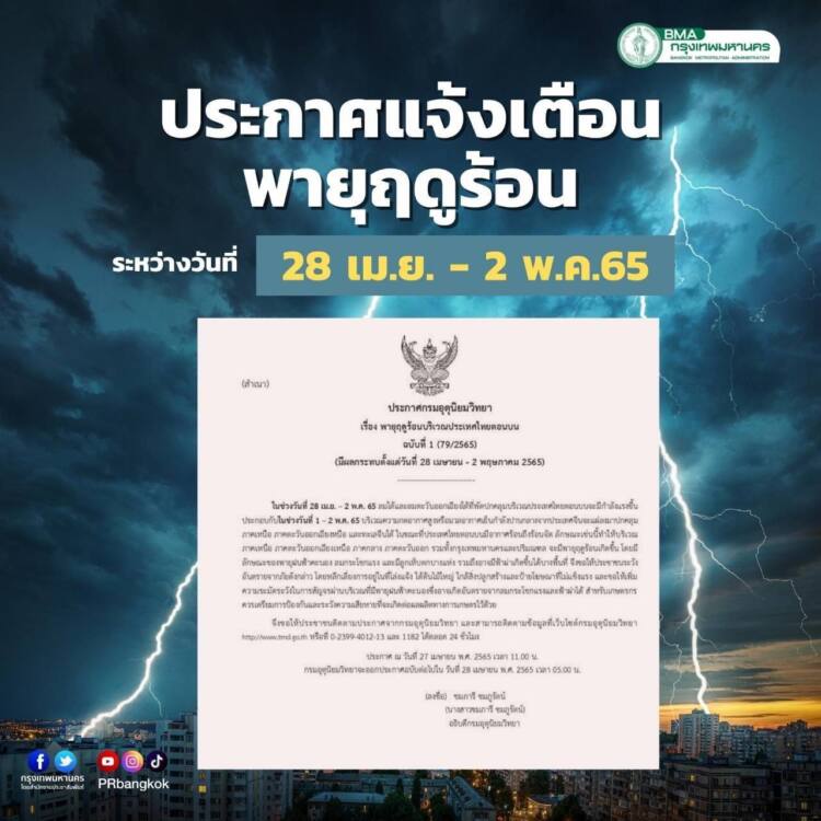 30 เม.ย.65/ นายขจิต ชัชวานิชย์ ปลัดกรุงเทพมหานคร เปิดเผยถึงการเตรียมความพร้อมรับมือพายุฤดูร้อน 28 เม.ย.-2 พ.ค.65 ว่า กรุงเทพมหานครได้เตรียมความพร้อมเจ้าหน้าที่ดับเพลิงและกู้ภัย ตลอดจนยานพาหนะ เครื่องมือเครื่องใช้ และอุปกรณ์ในการกู้ภัย เพื่อให้การช่วยเหลือประชาชนที่ประสบภัยจากพายุฤดูร้อนได้ทันที รวมทั้งขอให้สำนักงานเขตทุกแห่งสำรวจตรวจสอบต้นไม้ใหญ่ในพื้นที่เพื่อป้องกันการโค่นล้มเป็นอันตรายต่อชีวิตและทรัพย์สินของประชาชนในช่วงที่มีฝนฟ้าคะนองและลมกระโชกแรง