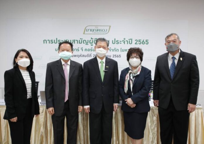 บริษัท พี อาร์ จี คอร์ปอเรชั่น จำกัด (มหาชน) ผู้บริหารกลุ่มธุรกิจในเครือข้าวมาบุญครอง ศูนย์อาหารเครือฟู้ด เลเจ้นด์ส บาย เอ็มบีเค และโครงการริเวอร์เดล มารีน่า จัดงานประชุมสามัญผู้ถือหุ้น ประจำปี 2565 ผ่านสื่ออิเล็กทรอนิกส์ หรือ E-AGM โดยมีนายสุเวทย์ ธีรวชิรกุล รองประธานกรรมการ (ที่ 3 จากซ้าย) พร้อมด้วยนายสมเกียรติ มรรคยาธร กรรมการผู้จัดการใหญ่(ที่ 5 จากซ้าย) นำทีมคณะกรรมการ และผู้บริหารของบริษัทฯ ที่มาเข้าร่วมประชุม โดยปฎิบัติตามมาตราการป้องกันการแพร่ระบาดของเชื้อไวรัสโควิด-19 อย่างเคร่งครัด ณ ห้องสัมนา ชั้น 8 อาคารเอ็ม บี เค เซ็นเตอร์ เมื่อเร็ว ๆ นี้