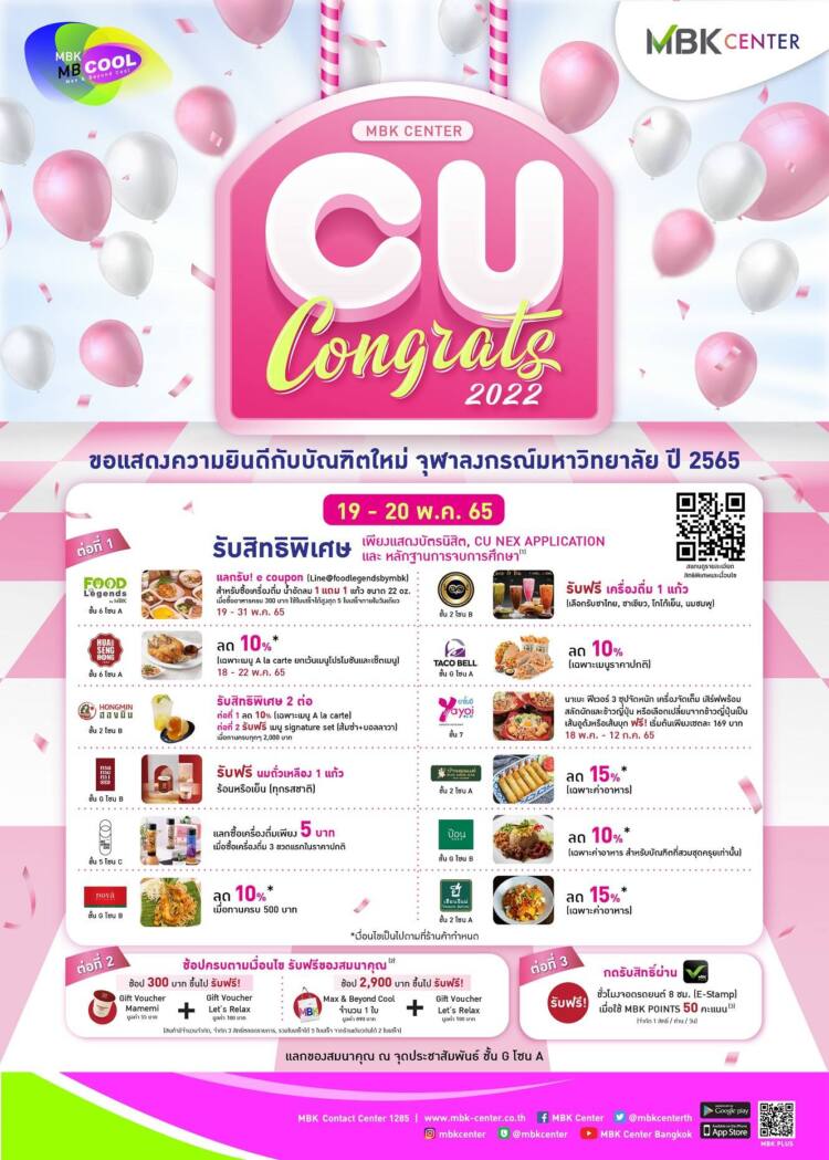 ศูนย์การค้าเอ็ม บี เค เซ็นเตอร์ ส่งแคมเปญสุดเอ็กซ์คลูซีฟ CU CONGRATS 2022 ร่วมฉลองความสำเร็จและแสดงความยินดีกับบัณฑิตใหม่ จุฬาลงกรณ์มหาวิทยาลัย ในวันพฤหัสบดีที่ 19 – วันศุกร์ที่ 20 พฤษภาคม 2565 เพียงแสดงบัตรประจำตัวนิสิตจุฬาลงกรณ์มหาวิทยาลัย, CU NEX Application หรือ หลักฐานการจบการศึกษา เพื่อรับสิทธิพิเศษ ดังนี้