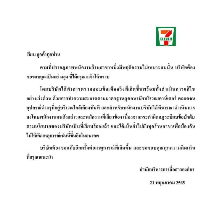 ล่าสุด ทางเซเว่นฯ ได้ชี้แจงเหตุการณ์ดังกล่าว โดยคำชี้แจงของสำนักบริหารการสื่อสารองค์กร เมื่อวันที่ 21 พฤษภาคม 2565 ระบุดังนี้