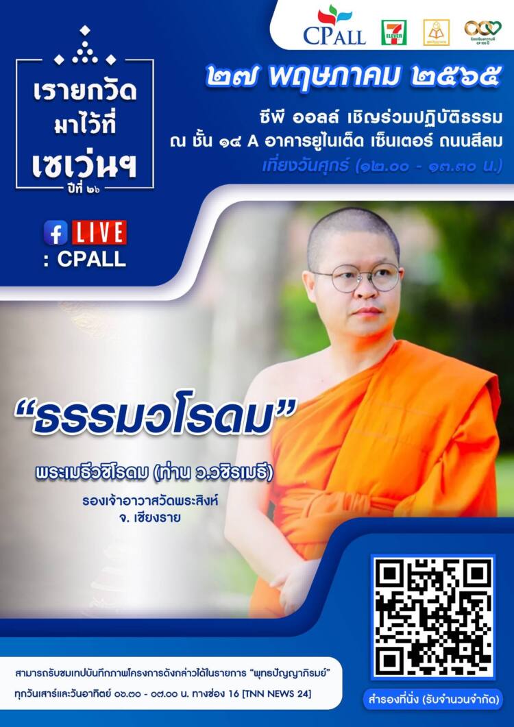 พบกับเรายกวัดมาไว้ที่เซเว่นฯ ในหัวข้อ “ธรรมวโรดม” โดย พระเมธีวชิโรดม (ว.วชิรเมธี) รองเจ้าอาวาสวัดพระสิงห์ จ.เชียงราย ผ่านช่องทาง facebook fanpage CPALL วันศุกร์ที่ 27 พฤษภาคม 2565 เวลา 12:00-13:30 น. และสามารถรับฟังย้อนหลังได้ที่ช่องทางเดียวกัน พร้อมรับฟังคติธรรมดี ๆ ในช่องทาง TikTok ได้ที่ ธรรมะ TikTok