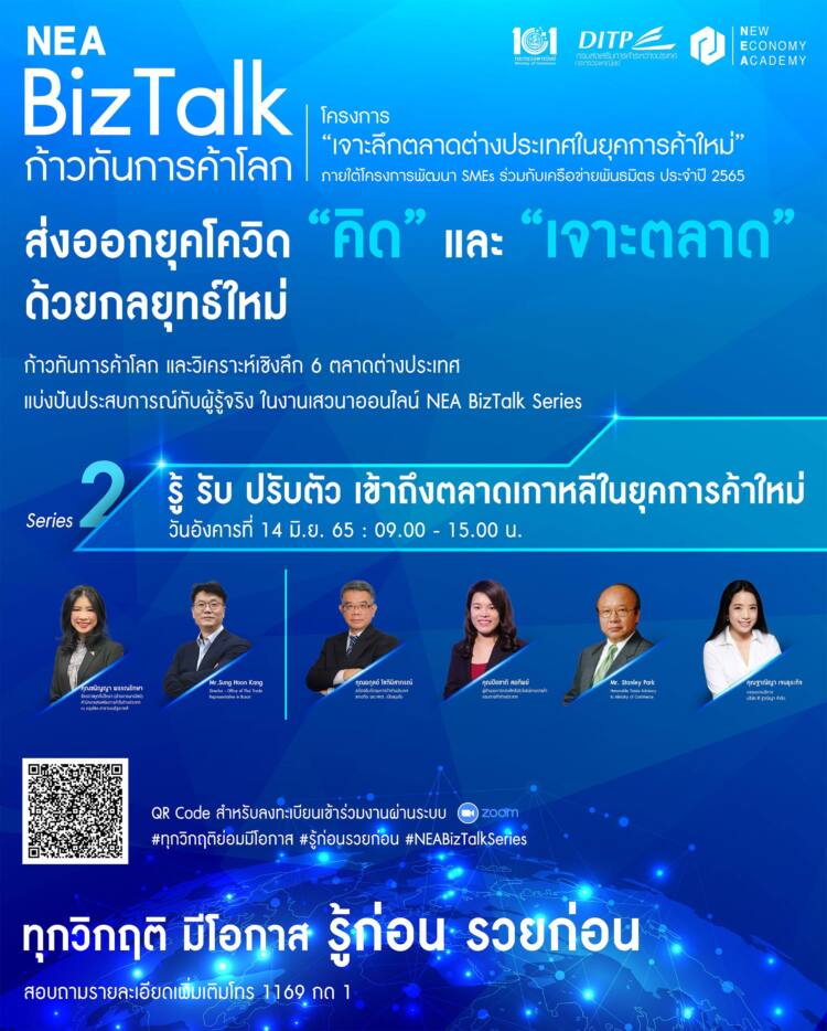 สำหรับการจัดเสวนา NEA BizTalk Series 2 : “รู้ รับ ปรับตัว เข้าถึงตลาดเกาหลีในยุคการค้าใหม่” กำหนดจัดในวันที่ 14 มิ.ย.2565 เวลา 09.00–15.00 น. โดยจะมีกูรูจากภาครัฐและเอกชน มาร่วมให้ความรู้อย่างเจาะลึก ได้แก่ ประเด็น “โอกาสของสินค้าไทยในตลาดเกาหลี ยุคการค้าใหม่” โดยน.ส.ชนัญญา พรรณรักษา อัครราชทูตที่ปรึกษา (ฝ่ายการพาณิชย์) สำนักงานส่งเสริมการค้าในต่างประเทศ ณ กรุงโซล สาธารณรัฐเกาหลี และ Mr.Sung Hoon Kang , Director–Office of Thai Trade Representative in Busan , “สิทธิประโยชน์ทางการค้าในกรอบความร่วมมือทางการค้า RCEP” โดยนายอดุลย์ โชตินิสากรณ์ อดีตอธิบดีกรมการค้าต่างประเทศ และอดีต ผอ. สคต. เมืองมุมไบ และน.ส.ปิยชาติ สอทิพย์ ผู้อำนวยการกองสิทธิประโยชน์ทางการค้า กรมการค้าต่างประเทศ และ “เทคนิคการนำเข้า–ส่งออกไปยังตลาดเกาหลี” โดย Mr. Stanley Park–Honorable Trade Advisory to Ministry of Commerce และ ฐาณิญา เจนธุระกิจ กรรมการบริหาร บริษัท ฑี ฐาณิญา จำกัด