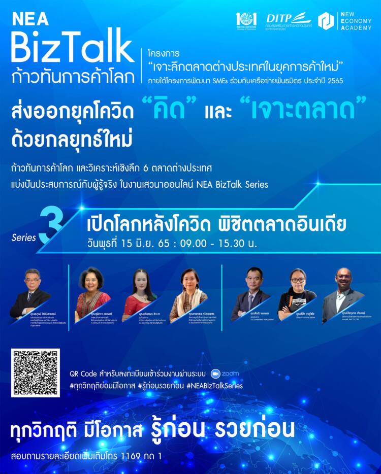 ส่วนการเสวนา NEA BizTalk Series 3 : “เปิดโลกหลังโควิด พิชิตตลาดอินเดีย” กำหนดจัดวันที่ 15 มิ.ย.2565 เวลา 09.00–15.30 น. จะได้พบกับปาฐกถาพิเศษ “มองอินเดียใหม่…ที่คนไทยไม่คุ้นเคย” โดยนายอดุลย์ โชตินิสากรณ์ อดีตอธิบดีกรมการค้าต่างประเทศ และอดีตผู้อำนวยการสำนักงานส่งเสริมการค้าในต่างประเทศ เมืองมุมไบ สาธารณรัฐอินเดีย, การเสวนา “โอกาสการค้าไทยในตลาดอินเดียหลังการแพร่ระบาดของไวรัสโควิด–19” โดยน.ส.สุพัตรา แสวงศรี กงสุล (ฝ่ายการพาณิชย์) สำนักงานส่งเสริมการค้าในต่างประเทศ ณ เมืองมุมไบ สาธารณรัฐอินเดีย , น.ส.สายทอง สร้อยเพชร อัครราชทูตที่ปรึกษา (ฝ่ายการพาณิชย์) สำนักงานส่งเสริมการค้าในต่างประเทศ ณ กรุงนิวเดลี สาธารณรัฐอินเดีย, น.ส.หทัยชนก สีวะรา ผู้อำนวยการสำนักงานส่งเสริมการค้าในต่างประเทศ ณ เมืองเจนไน สาธารณรัฐอินเดีย และ “ทำธุรกิจอย่างไร ให้ชนะใจอินเดีย?” โดยบีไยกุมาร ปานเดย์ ผู้จัดการฝ่ายขายและการตลาดต่างประเทศ Innovek Asia Co., Ltd., สีฟ้า เกตุไชโย เจ้าของร้านอาหาร SEEFAH และ สันติ จงคงคา รองประธาน ITD Cementation India Limited