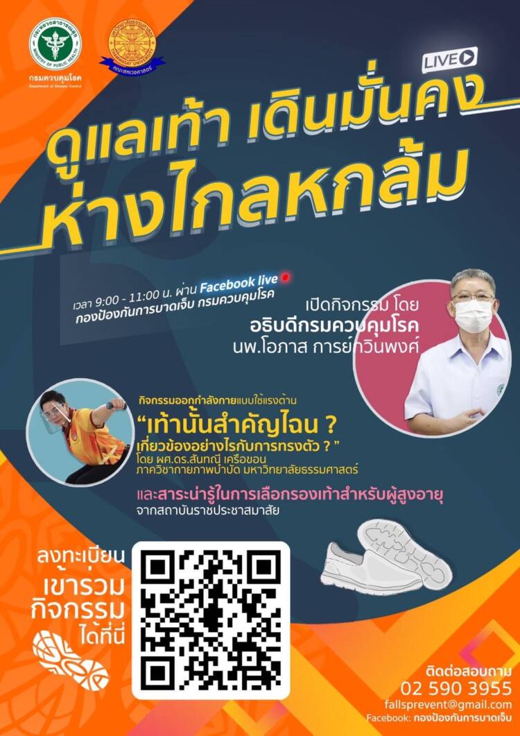 ทั้งนี้ กรมควบคุมโรคได้ร่วมกับเครือข่ายขับเคลื่อนการดำเนินงานและได้จัดกิจกรรมรณรงค์ป้องกันการพลัดตกหกล้ม ภายใต้แนวคิด “ดูแลเท้า เดินมั่นคง ห่างไกลล้ม” จึงขอเชิญชวนเครือข่ายและประชาชนผู้สนใจ ออกกำลังกายแบบใช้แรงต้านพร้อมกันทั่วประเทศ พร้อมด้วยสาระน่ารู้ในการดูแลเท้า การเลือกรองเท้า ผ่าน Facebook Live “กองการป้องกันการบาดเจ็บ” ในวันที่ 14 มิถุนายน 2565 เวลา 9.00-11.00 น. สามารถสอบถามข้อมูลเพิ่มเติมได้ที่กองป้องกันการบาดเจ็บ โทร 0 2590 3955 หรือสายด่วนกรมควบคุมโรค โทร 1422