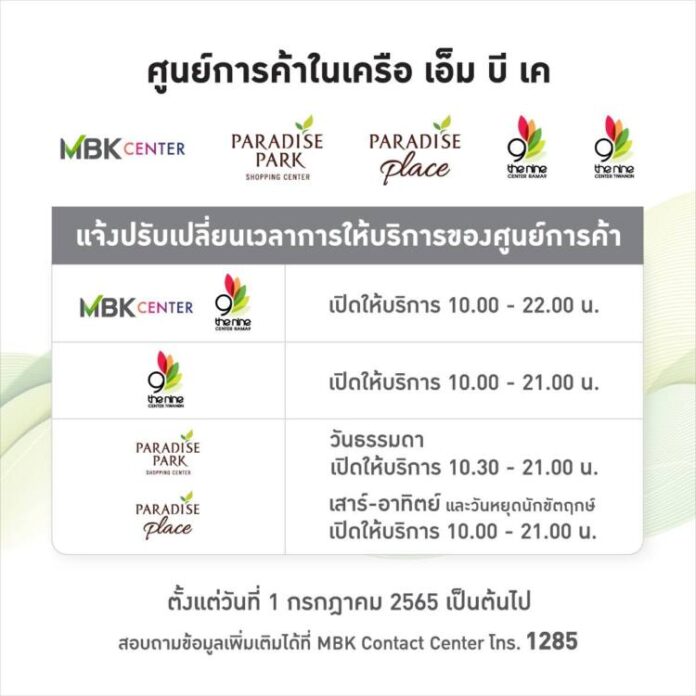 ให้คุณช้อปได้มากกว่าที่เคย ใช้เวลาแห่งความสุขได้นานขึ้น ศูนย์การค้าเครือเอ็ม บี เค ได้แก่ เอ็ม บี เค เซ็นเตอร์ (MBK CENTER) พาราไดซ์ พาร์ค (PARADISE PARK) พาราไดซ์ เพลส (PARADISE PLACE) เดอะไนน์ เซ็นเตอร์ พระราม 9 (THE NINE CENTER RAMA 9) เดอะไนน์ เซ็นเตอร์ ติวานนท์ (THE NINE CENTER TIWANON) แจ้งปรับเปลี่ยนเวลาให้บริการตั้