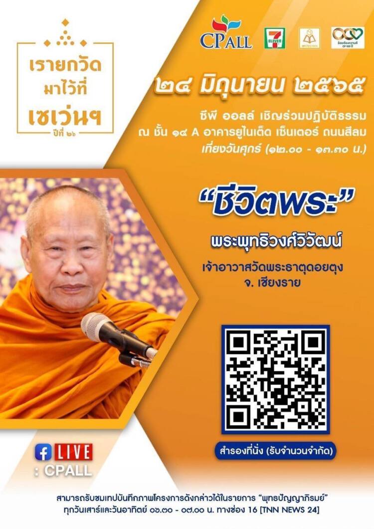 พบกับเรายกวัดมาไว้ที่เซเว่นฯ ผ่านช่องทาง facebook fanpage CPALL ทุกวันศุกร์ เวลา 12:00-13:30 น. และสามารถรับฟังย้อนหลังได้ที่ช่องทางเดียวกัน พร้อมรับฟังคติธรรมดี ๆ ในช่องทาง TikTok ได้ที่ ธรรมะ TikTok