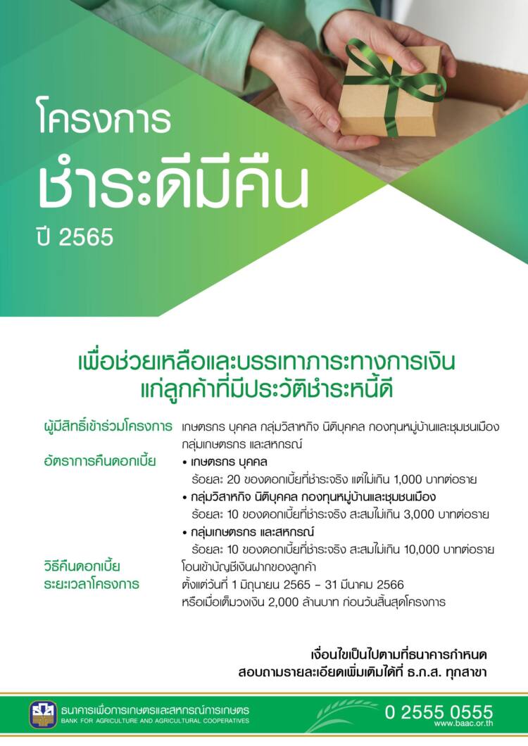 สำหรับโครงการชำระดีมีคืน ปีบัญชี 2565 มุ่งเน้นให้เกษตรกร บุคคล กลุ่มบุคคล กลุ่มเกษตรกรสหกรณ์ นิติบุคคล รวมถึงกองทุนหมู่บ้านและชุมชนเมือง ซึ่งเป็นลูกค้าที่สามารถชำระต้นเงินหรือดอกเบี้ยได้ปกติหรือมีหนี้ค้างช าระ ไม่เกิน 3 เดือน ในปีบัญชี 2565 ที่มีหนี้คงเหลือ ณ วันที่ 30 เมษายน 2565 (ยกเว้นหนี้เงินกู้โครงการที่ได้รับชดเชยดอกเบี้ยตามนโยบายรัฐบาล) มีแรงจูงใจในการชำระหนี้ตามกำหนดเวลา โดยธนาคารจะคืนดอกเบี้ยเข้าบัญชีเงินฝากลูกค้าโดยตรงในวันถัดไป วงเงินรวม 2,000 ล้านบาท สำหรับเกษตรกรบุคคล รับดอกเบี้ยคืน อัตราร้อยละ 20 ของดอกเบี้ยที่ชำระจริง ไม่เกินรายละ 1,000 บาท และกลุ่มเกษตรกรนิติบุคคล กองทุนหมู่บ้านและชุมชนเมือง รับดอกเบี้ยคืน อัตราร้อยละ 10 ของดอกเบี้ยที่ชำระจริง สะสมไม่เกิน 3,000 บาท และกรณีกลุ่มเกษตรกร สหกรณ์ สะสมรายละไม่เกิน 10,000 บาท