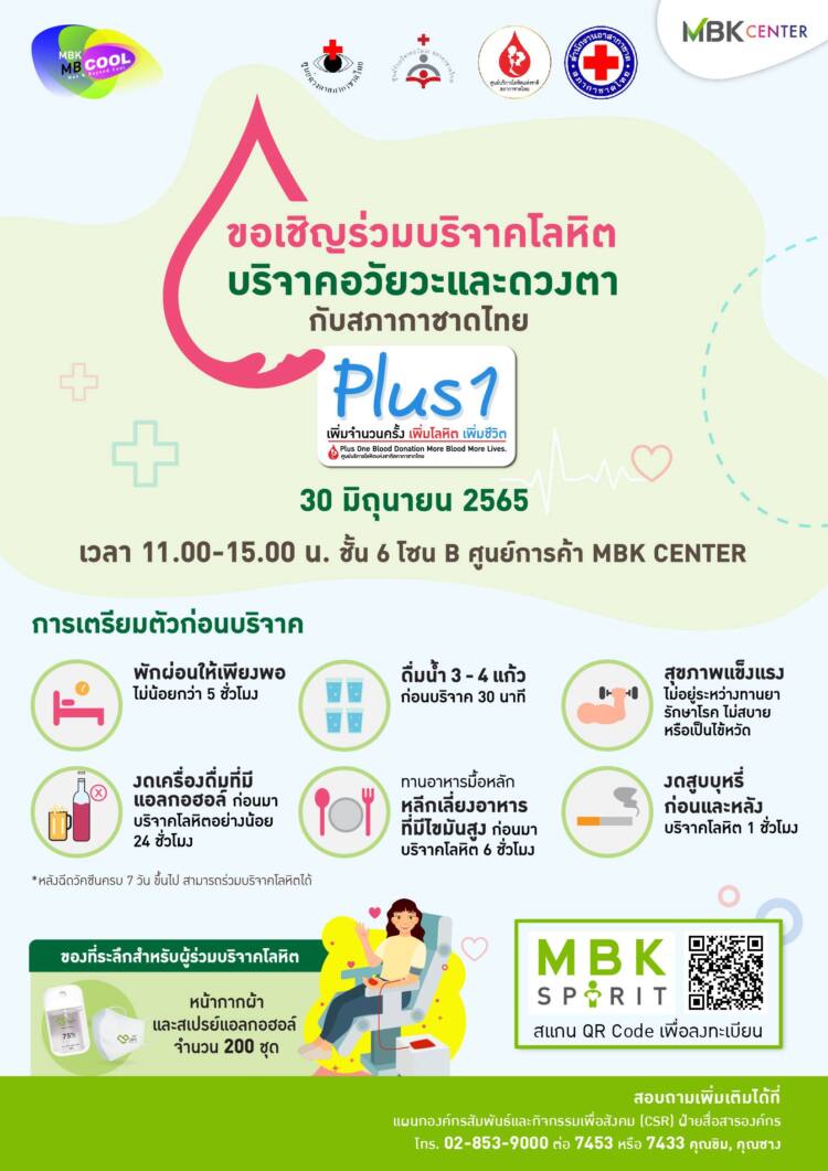 ศูนย์การค้าเอ็ม บี เค เซ็นเตอร์ ร่วมกับ สภากาชาดไทย เชิญชวนร่วมบริจาคโลหิต บริจาคอวัยวะและดวงตา กู้วิกฤตการขาดแคลน ในกิจกรรม Plus 1 เพิ่มจำนวนครั้ง เพิ่มโลหิต เพิ่มชีวิต ในวันพฤหัสบดีที่ 30 มิถุนายน 2565 ตั้งแต่เวลา 11.00 น. – 15.00 น. บริเวณชั้น 6 โซน B พร้อมรับของที่ระลึก Limited Edition หน้ากากผ้า และ สเปรย์แอลกอฮอล์