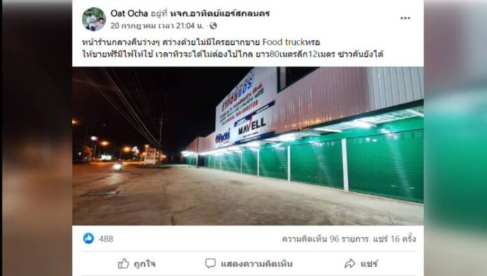 นักธุรกิจหนุ่มชาวจังหวัดสกลนคร โพสต์เฟซบุ๊ก เชิญชวนประชาชนทั่วไปมาค้าขายสินค้าในเวลากลางคืน หน้าร้านมีขนาดกว้างขวาง ไม่เก็บค่าเช่าแสงสว่างเพียงพอและน้ำประปาให้ใช้ฟรี เผยเข้าใจหัวอกคนหาเช้ากินค่ำ