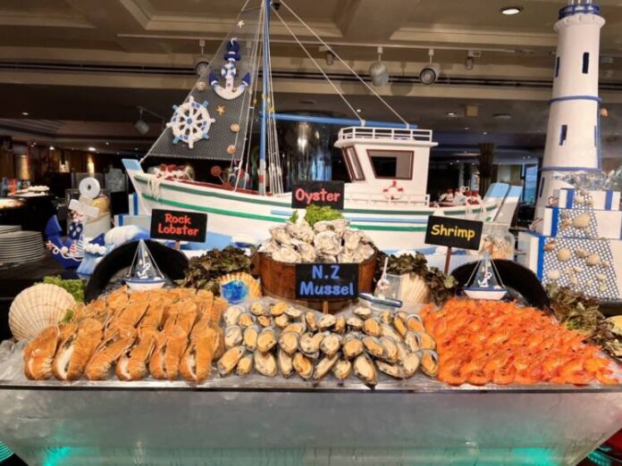 บุฟเฟต์ซีฟู้ดรวมซูชิพรีเมียมมื้อเย็น ที่ ดิเอมเมอรัลด์ ค็อฟฟี่ช็อพ จัดเต็มทั้งกุ้งแม่น้ำ กั้งกระดาน หอยแมลงภู่นิวซีแลนด์ หอยนางรม หอยหวาน carving station ข้าวต้มกุ้ย ขาหมูในตำนาน อาหารไทยและเทศ ของหวานสุดอลังการงานสร้าง รวมเครื่องดื่มชา-กาแฟ-น้ำอัดลม แถมได้ฟินกับเมนู “ซูชิพรีเมียม แซลมอนดองซีอิ๊วเกาหลี” ที่อร่อยไม่แพ้ใคร