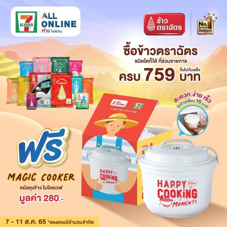 ข้าวตราฉัตร จัดโปรสุดคุ้ม !! ที่ 7- Eleven All Online ห้างใกล้บ้าน ส่งไอเทมเด็ด MAGIC COOKER หม้อหุงข้าวไมโครเวฟ เปิดประสบการณ์ใหม่ในการหุงข้าวใช้เวลาแค่เพียง 16 นาที (มูลค่า 280.-) สะดวกสบายมาก เมื่อซื้อสินค้าข้าวตราฉัตรชนิดใดก็ได้ที่ร่วมรายการ ครบ 759 บาท ขึ้นไป/ใบเสร็จ *ของแถมมีจำนวนจำกัด